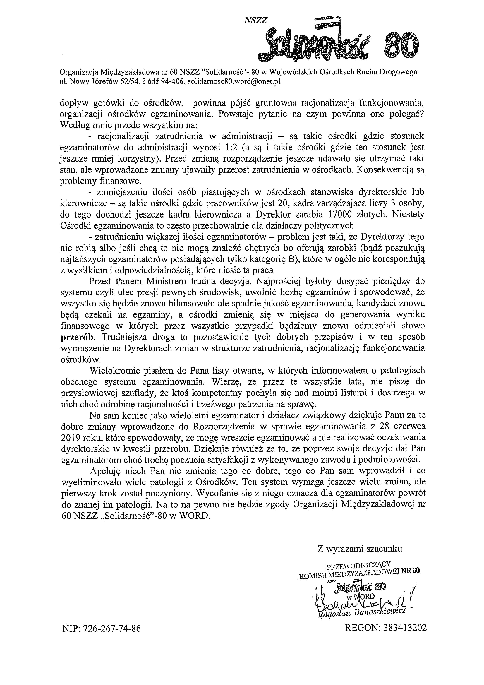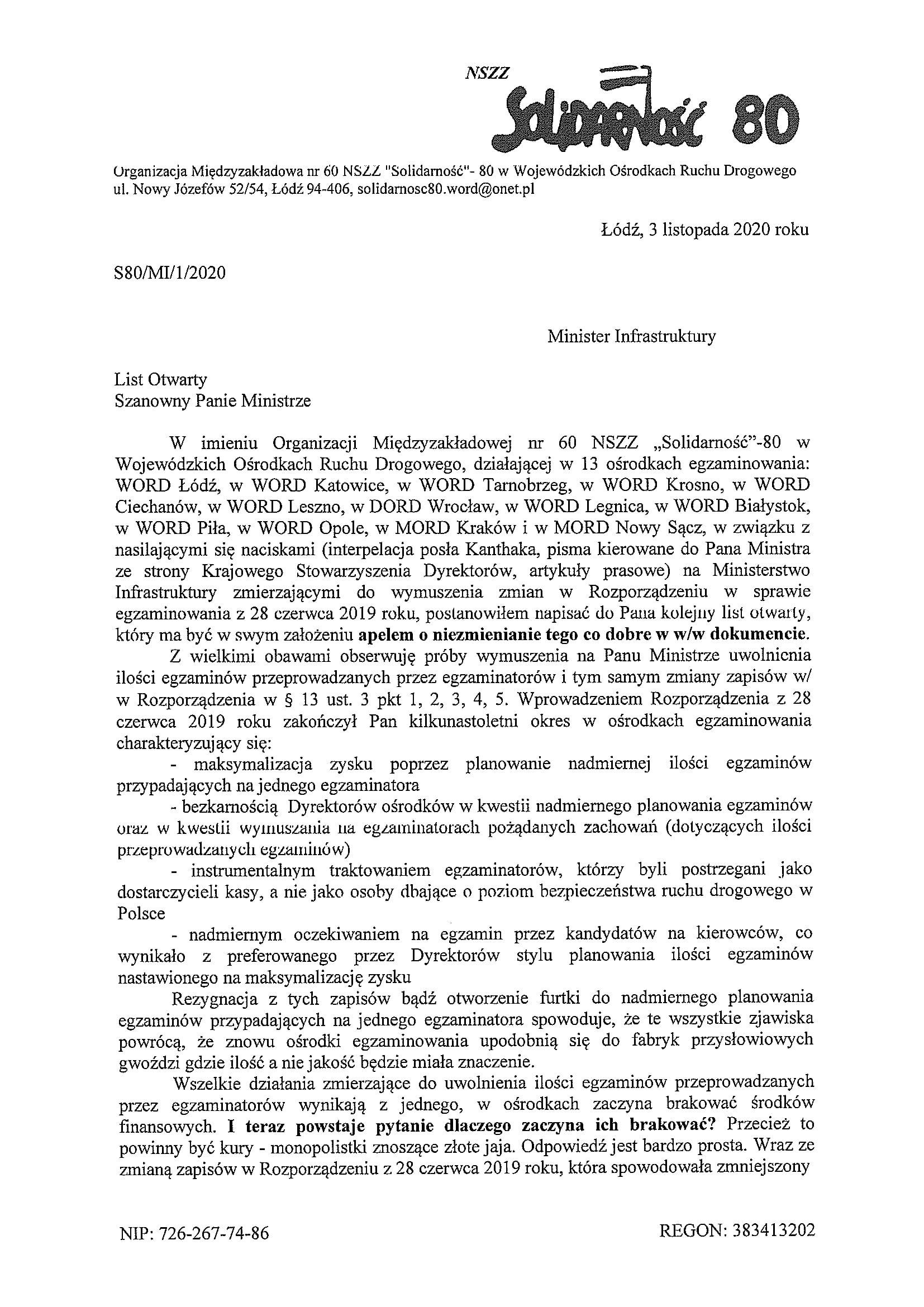 Przewodniczący Komisji Międzyzakładowej NSZZ Solidarność-80 w dniu 3 listopada wystosował list otwarty do Ministra Infrastruktury, w którym zarzuca osobom zarządzającym ośrodkami egzaminowania nierówne traktowanie egzaminatorów, niegospodarność finansami publicznymi oraz próbę powrotu do systemu “przerabiania” jak największej ilości egzaminów przez każdego z egzaminatorów.